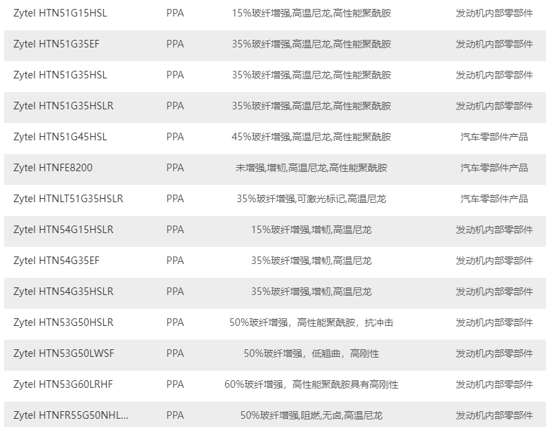 杜邦Zytel HTN 高溫尼龍主要牌號(hào)及應(yīng)用如下: