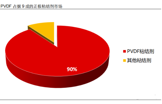 鋰電粘結(jié)劑 PVDF 在全部正極粘結(jié)劑的市場滲透率高達 90%。