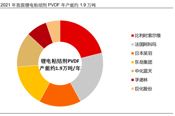 當前常規(guī)級 PVDF 的生產(chǎn)技術(shù)已較為成熟,幾乎不存在技術(shù)壁壘,鋰電粘結(jié)劑 PVDF 生產(chǎn)技術(shù)要求較高,只有少數(shù)國外企業(yè)掌握并具備量產(chǎn)能力。由于技術(shù)壁壘高,少數(shù) PVDF 能夠量產(chǎn)通過電池廠商驗證的鋰電粘結(jié)劑 PVDF 產(chǎn)品,2021 年我國鋰電粘結(jié)劑 PVDF 年產(chǎn)能預(yù)計僅 1.9 萬噸/年。