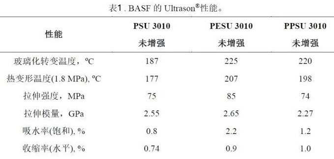 目前,聚砜的供應(yīng)商主要有BASF。下表1以BASF的Ultrason?為例,展示PSU, PESU和PPSU的性能。三者均可進(jìn)一步用玻纖和碳纖增強(qiáng),采用注塑、擠出的工藝加工成型。