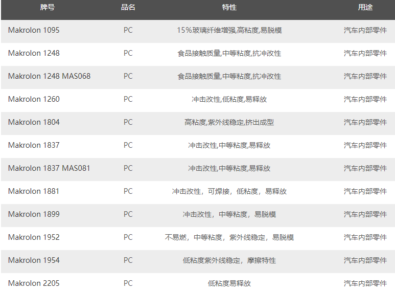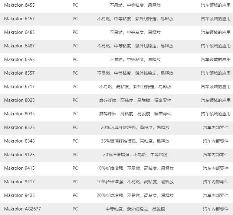 科思創(chuàng)Makrolon PC主要應(yīng)用于汽車(chē)內(nèi)部零件、汽車(chē)領(lǐng)域的產(chǎn)品牌號(hào)如下: