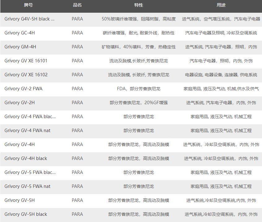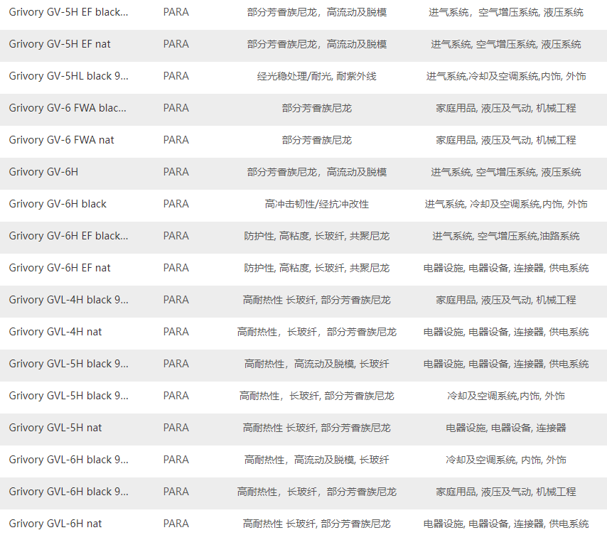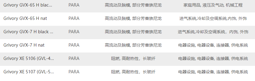 Grivory PARA材料產(chǎn)品牌號眾多,又各有不同的產(chǎn)品特性,如何快速的找到需要瑞士-EMS Grivory PARA產(chǎn)品牌號原料牌號?以下給提供是瑞士-EMS Grivory PARA塑料的常用系列及其產(chǎn)品特性如下表。