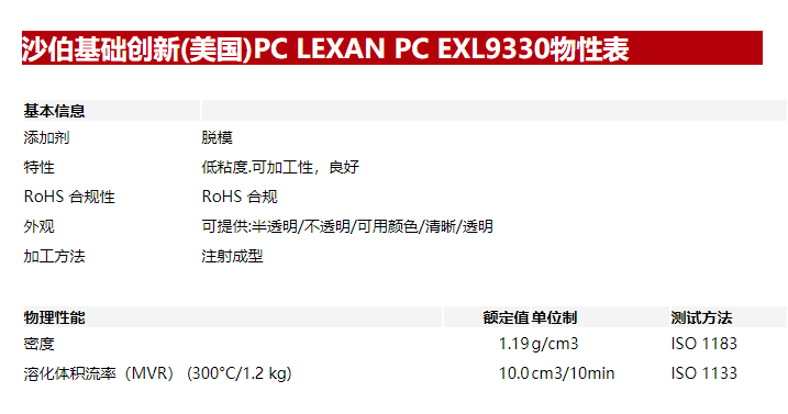 沙伯基礎創(chuàng)新(美國)L EXAN PC EXL .9330聚碳酸酯產品說明特性: