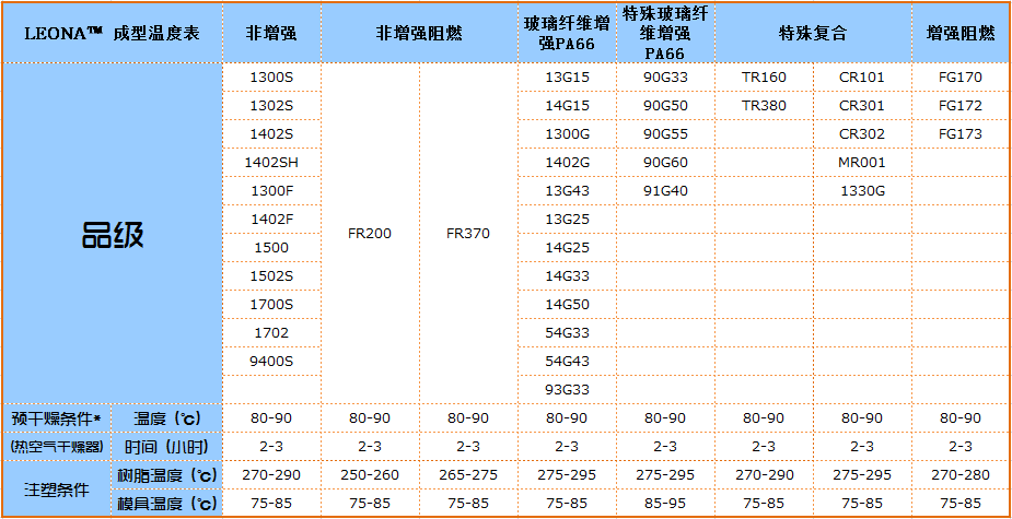 | PA66 14G25 | 加25%玻璃纖維增強,超高的抗熱老化,抗疲勞和抗蠕變 | 機械和電氣零件,發(fā)動機架,以及其他汽車機罩下零件 | |