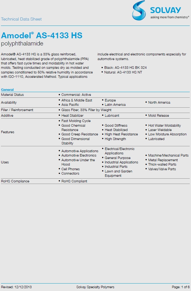 Solvay Amodel PPA AS-4133 HS BK324塑膠原料,物性數(shù)據(jù),SGS報(bào)告,UL認(rèn)證,MSDS報(bào)告,RoHS報(bào)告,Reach報(bào)告,黃卡,材質(zhì)報(bào)告,塑料最新報(bào)價(jià)。
