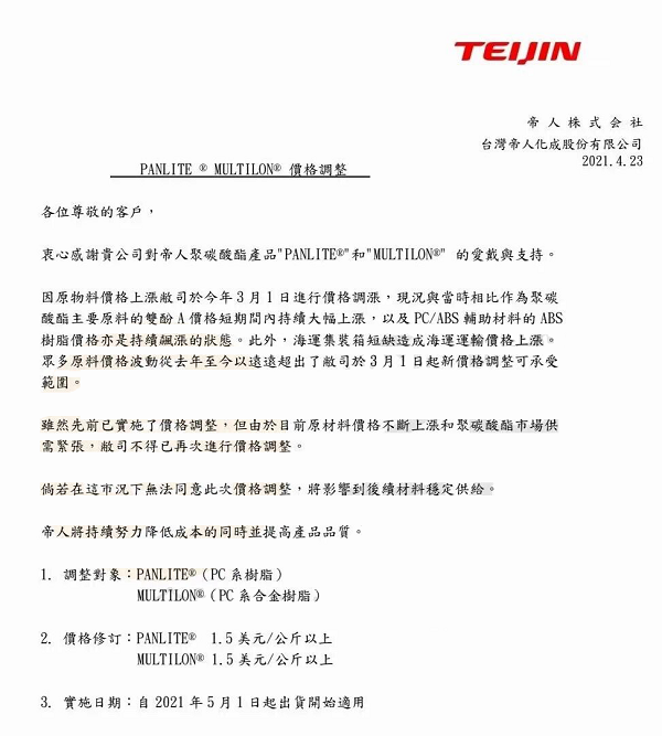 帝人株式會(huì)社23日宣布,雖然在3月1日已經(jīng)宣布部分產(chǎn)品上調(diào),但由于雙酚A成本暴漲,PC/ABS和ABS樹脂塑膠原料等部分輔料的價(jià)格持續(xù)飆漲疊加海運(yùn)成本不斷上漲,公司不得不對(duì)PC的價(jià)格進(jìn)行上調(diào),漲價(jià)于2021年5月1日起生效:
