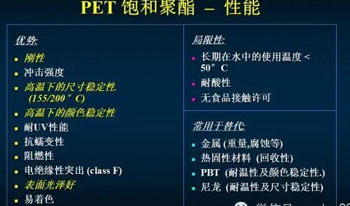 作為飽和聚酯的代表材料,PET有著比較大的優(yōu)勢,如高溫穩(wěn)定性,表面光澤度高等,但缺點也很明顯,如不耐熱水(使用溫度須低于50℃),參考下圖: