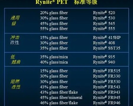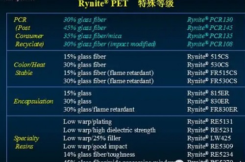 杜邦的Rynite PET產(chǎn)品是全部為改性等級的,沒有非填充切片級材料: