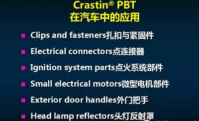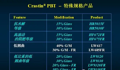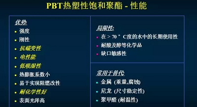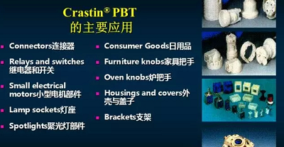 PBT 又可 稱為熱塑性聚酯塑料,為適用于不同加工業(yè)者使用,一般多少會加入添加劑,或與其它塑料 摻混,隨著添加物比例不同,可制造不同規(guī)格的產(chǎn)品。由于 PBT 具有耐熱性、耐候性、耐 藥品性、電氣特性佳、吸水性小、光澤良好,廣泛應(yīng)用于電子電器、汽車零件、機(jī)械、家用 品等,而 PBT 產(chǎn)品又與 PPE、PC、POM、PA 等共稱為五大泛用工程塑料。