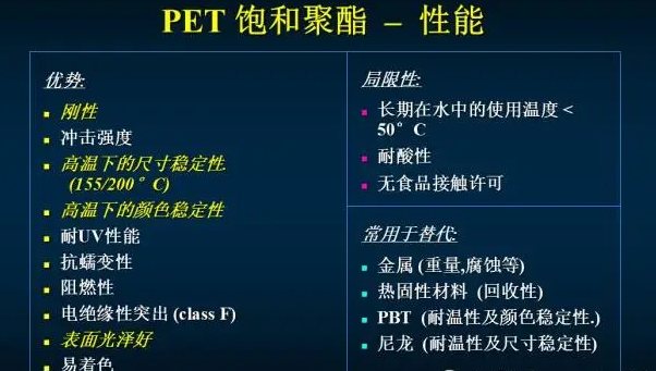 作為飽和聚酯的代表材料,PET有著比較大的優(yōu)勢,如高溫穩(wěn)定性,表面光澤度高等,但缺點也很明顯,如不耐熱水(使用溫度須低于50℃),參考下圖:
