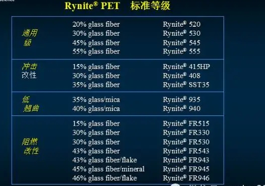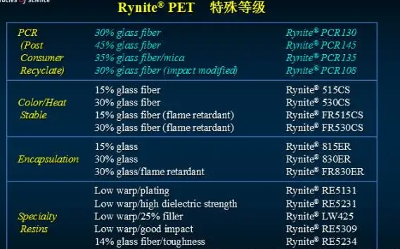 請注意杜邦的Rynite PET產(chǎn)品是全部為改性等級的,沒有非填充切片級材料: