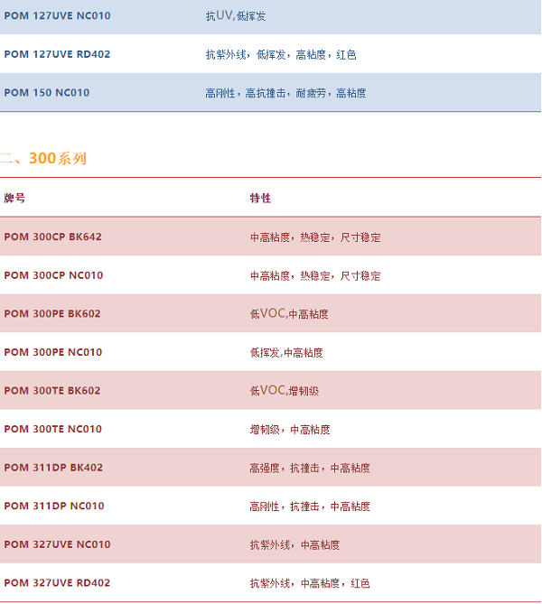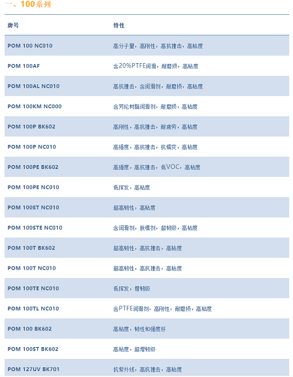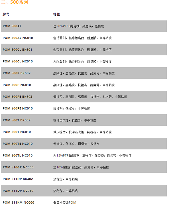 杜邦的聚甲醛主要是按照其粘度來(lái)分類(lèi)的:產(chǎn)品的第一個(gè)數(shù)字近似代表其熔融指數(shù),所以按分類(lèi)有100、300、500、900系列,其熔融指數(shù)隨數(shù)字變大而增大(熔融指數(shù)越大,粘度越小),如粘度比較:POM 100NC010>POM 300CP BK642>POM 500AF>POM 900P BK602。