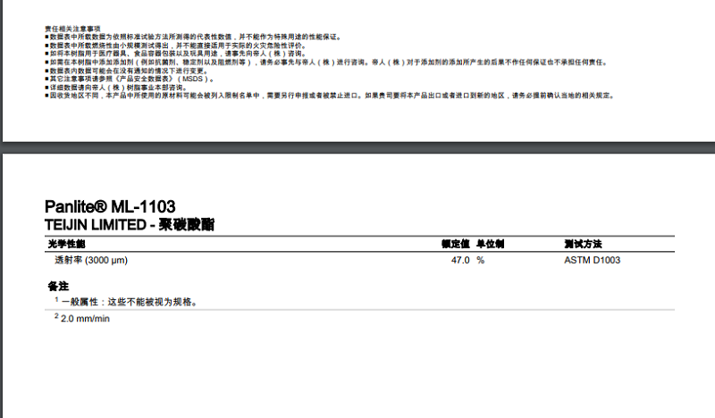 PC原料帝人Panlite ML-1103物性指標(biāo):