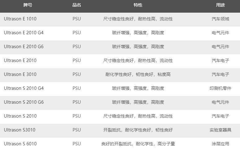德國-巴斯夫 Ultrason PSU的主要牌號及應(yīng)用: