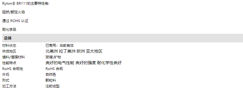 Ryton? BR111是一種聚苯硫醚(PPS)材料,含有的填充物為玻璃礦物。 該產(chǎn)品在北美洲、拉丁美洲、歐洲或亞太地區(qū)有供貨,加工方式為:注射成型。
