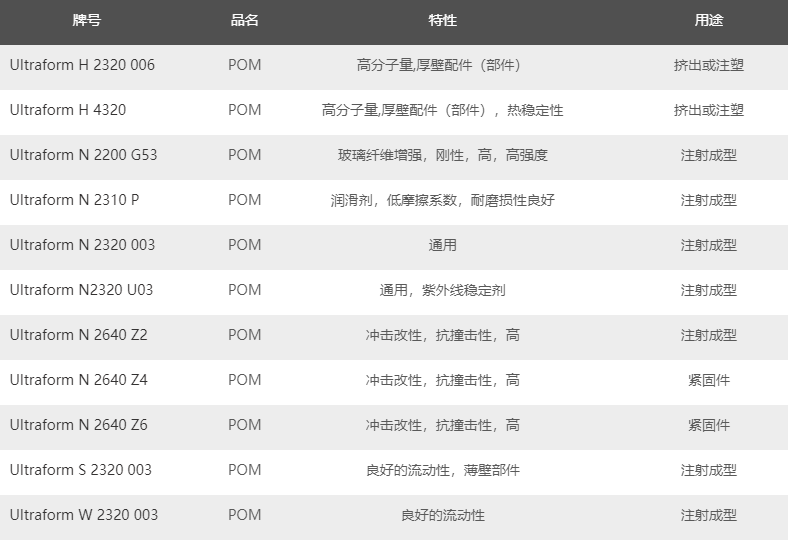 德國-巴斯夫 Ultraform POM工程塑料主要牌號及性能物性: