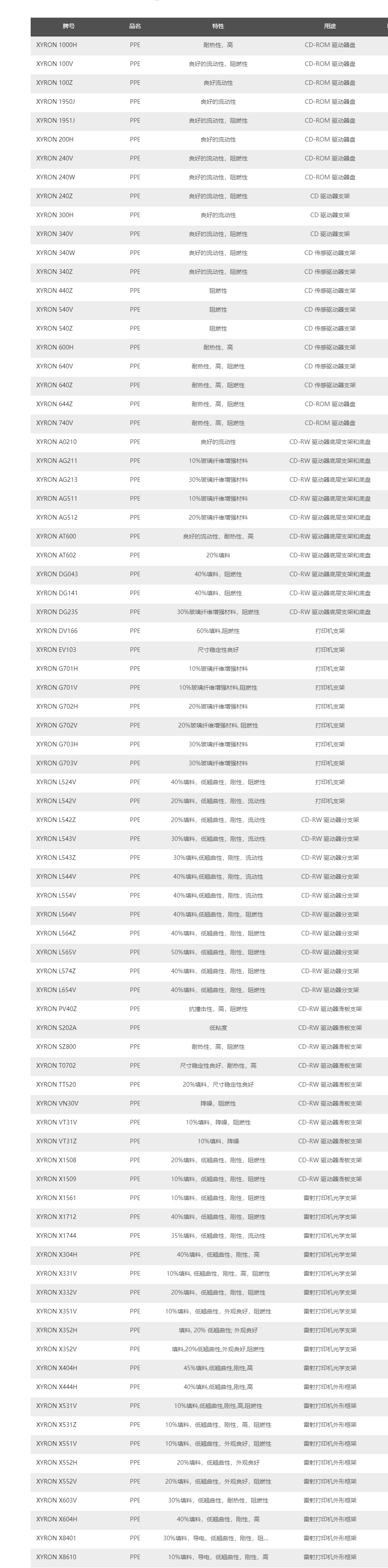 日本旭化成XYRON PPE產(chǎn)品牌號(hào)及應(yīng)用: