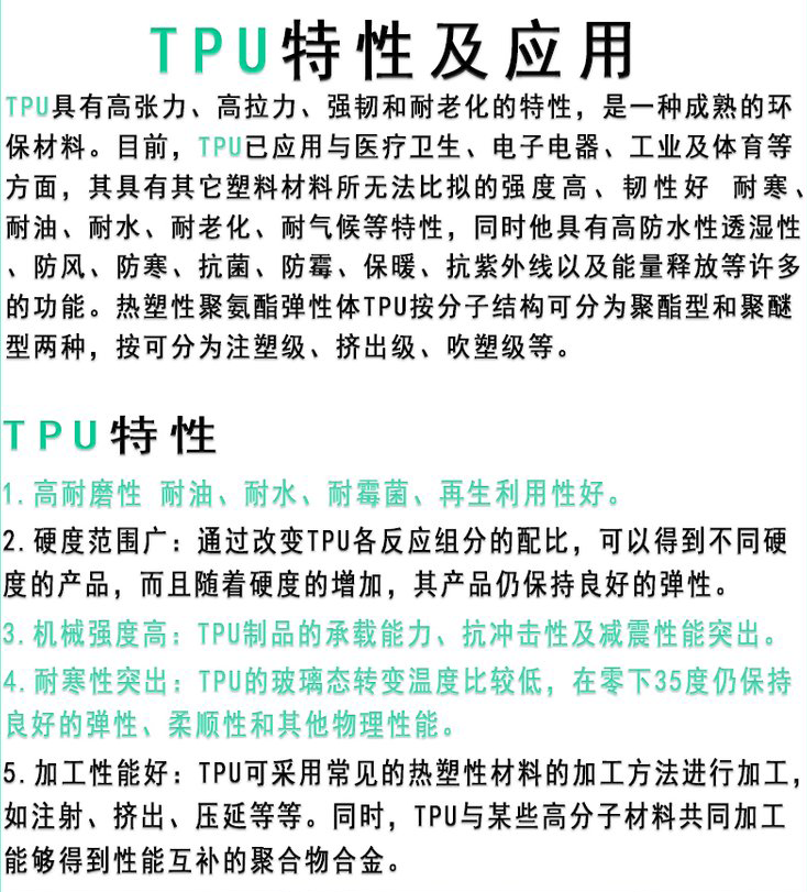 透明級、熱穩(wěn)定性、抗紫外線、標(biāo)準(zhǔn)級、耐水解,用途級別:通用級、管材級、薄膜級、運動器材、電線電纜級。
